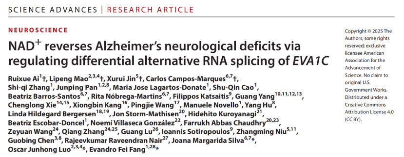 在生物学机制探索领域,德睿智药团队联合挪威奥斯陆大学等院校在《Science》子刊、国际顶级综合性期刊《Science Advances》(IF: 12.5)发表了题为“NAD+ reverses Alzheimer’s neurological deficits via regulating differential alternative RNA splicing of EVA1C”的研究论文。